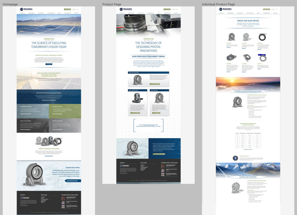 Kinematics Manufacturing (KMI) is leading supplier of highly-engineered, precision motion control solutions, servicing the solar, oil & gas, mining, construction and other industrial markets. They wanted a design that highlighted their expertise while showcasing their products. The interface needed to be easy to navigate so viewers can compare specifications across various categories of products across desktop and mobile devices.